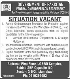 Only male candidates can apply for Federal Ombudsperson Secretariat Jobs In Islamabad October 2025 Qualification /Experience Required:Advisor (International Cooperation & Strategic Guidance) The required Qualification/Experience with complete criteria can be checked at FOSPAH’s website: www.fospah.gov.pkand more experienced candidates should apply before 30 October 2025.