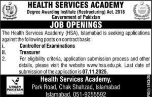 Candidates if you are seeking Health Service Academy Jobs In Islamabad October 2025 if yes. It would be best if you tried to complete read Health Service Academy job because you can easily apply for these vacancies Controller of Examinations Treasurer.