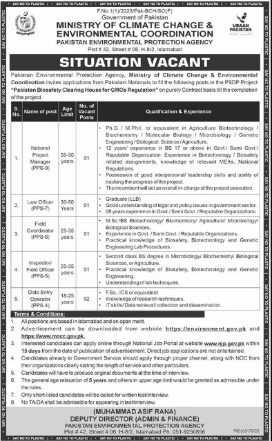 Only male candidates can apply for Ministry Of Climate Change Jobs In Islamabad November 2025 Qualification /Experience Required:SAY NO TO PLASTIC Ph.D / M.Phil. or equivalent in Agriculture Biotechnology/Biochemistry / Molecular Biology / Microbiology, Genetic Engineering/Biological Science/Agriculture 12 years’ experience in BS 17 or above in Govt/ Semi Govt/ Reputable Organization. Experience in Biotechnology Biosafety-related assignments, knowledge of relevant MEAS, National Regulations, and more experienced candidates should apply before 20 October 2025.