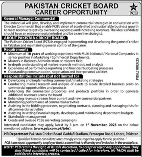 Candidates if you are seeking Pakistan Cricket Board Jobs In Lahore November 2025 if yes. It would be best if you tried to complete read Pakistan Cricket Board because you can easily apply for these vacancies General Manager Commercial.