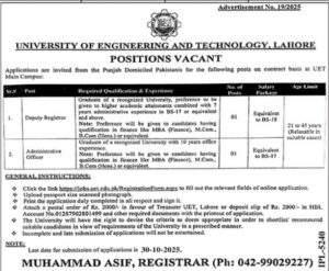 Candidates if you are seeking University Of Engineering And Technology Jobs In Lahore October 2025 if yes. It would be best if you tried to complete read University Of Engineering And Technology job because you can easily apply for these vacancies Deputy Registrar Administrative Officer.